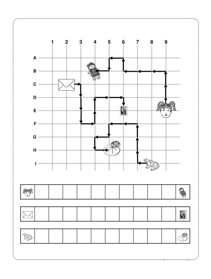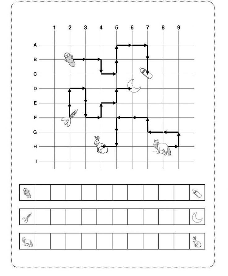 - Kodowanie obrazków. Tu już przyda się umiejętność liczenia (wystarczy do 10) i znajomość alfabetu. To poniekąd zabawa związana z popularną grą w „statki”. Prosty rysunek należy nałożyć na planszę ze współrzędnymi. Plansza powinna mieć formę kratek. Obrazek tworzą po prostu odpowiednio pokolorowane kwadraty. W pionie i poziomie okienka planszy są oznaczone liczbami i literami alfabetu. Dziecko może albo zakodować współrzędne dla danego obrazka, podając odpowiednie liczby i litery dla konkretnych kolorów i ich położenia, albo na odwrót – sugerując się współrzędnymi, narysować obrazek (pokolorować odpowiednie pola).