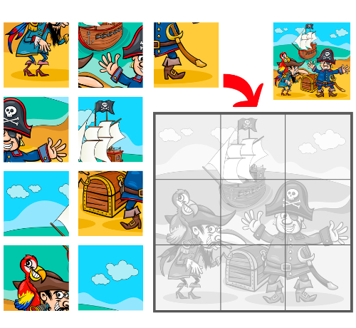 - obrazek pirata pocięty na części,