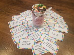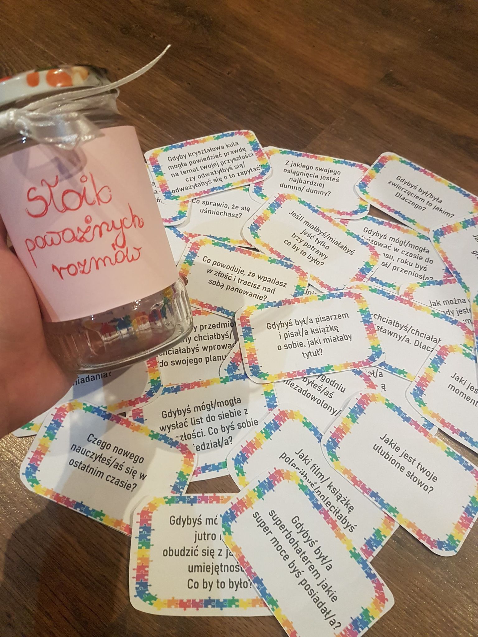 SŁOIK POWAŻNYCH ROZMÓW – gra zawiera 48 kart z różnorodnymi osobistymi pytaniami, gracze na zmianę losują dla siebie pytania i starają się na nie odpowiedzieć. Gra tak naprawdę może być tylko wstępem do dalszych rozmów, możemy naszych uczniów o coś dopytać lub zachęcić ich do stawiania innych pytań. Pytania do gry stworzyłam wspólnie z jednym z moich uczniów. Miłej zabawy!