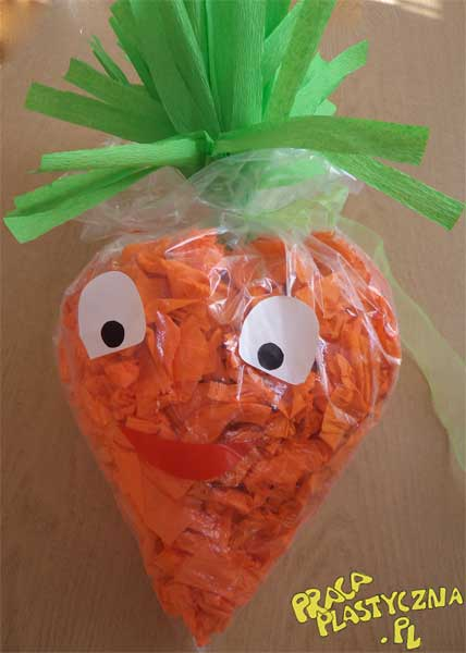 8. „Wesoła marchewka”- praca plastyczna. Przygotujcie: przeźroczysty worek, pomarańczowa i zielona bibuła, nożyczki, zielona wstążka, kartki białego, czarnego i czerwonego papieru. Do woreczka wrzucacie kulki wykonane z pomarańczowej bibuły. Natkę pietruszki wykonacie z pomocą zielonej bibuły, która musicie naciąć w paski. Gdy worek jest wypełniony, na górną część z pomocą rodzica nałóżcie natkę i zwiążcie. Na koniec przyklejcie oczy i usta 🙂