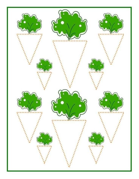 7. „Marchew po kropkach”. Chwyćcie pomarańczowe kredki obrysujcie i pokolorujcie marchewki. Jaki mają kształt te marchewki?
