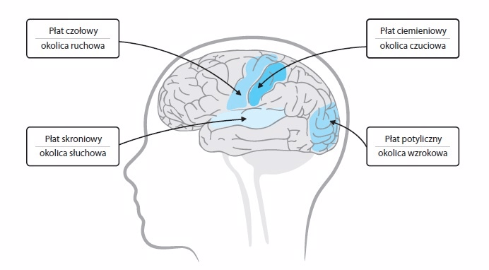 nieprawidłowo. Pobudzenia powstałe w receptorach zmysłu dotyku biegną od nich skomplikowanymi drogami nerwowymi ku górze, do kory mózgowej, aby w płacie ciemieniowym utworzyć „reprezentację czuciową” naszego ciała. To dzięki niej uświadamiamy sobie wrażenia płynące z ciała (ryc. 5). Rozwój schematu ciała, tak samo jak innych funkcji, jest związany z dojrzewaniem mózgu i jego rozwojową plastycznością.