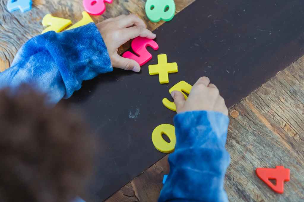 ► Zabawy z zastosowaniem drewnianych klocków i koralików – możliwości zabawy jest nieskończenie wiele: koraliki mogą być jabłkami, a koła zbieranymi grzybkami. Wymienione przedmioty są małe, kolorowe i interesujące dla dziecka; można je dzielić, dodawać, odejmować, nawlekać i ściągać ze sznurków. Wszystko zależy od nas. Dodawać można również z użyciem dłuższych i krótszych brył lub klocków z przedziałką odzwierciedlającą długość.