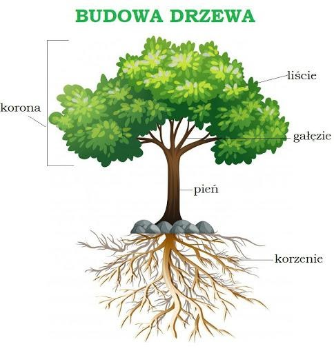 Drzewa to największe rośliny lądowe. Drzewo składa się ze zdrewniałego pnia na którym osadzona jest wspaniała korona. Koronę tworzą gałęzie zwane konarami. Nieco cieńsze odrosty konarów – to gałęzie. Na gałęziach rosną liście i kwiaty – a później owoce. Pod ziemią znajdują się korzenie drzewa, które również są wielkie i podobne kształtem do swoich koron – tyle, że nie posiadają liści. Korzenie pobierają i przekazują wodę do każdej części drzewa. Drzewa dają nam mnóstwo tlenu. Drzewa dają nam owoce i nasiona, które rozsiewa wiatr. Na drzewach ptaki budują swoje gniazda i wychowują swoje potomstwo, a w dziuplach mieszkają wiewiórki. Drzewa utrzymują wilgotność powietrza – zapobiegają suszom i tworzą wielkie ekosystemy – czyli lasy, które są schronieniem dla wielu zwierząt i roślin. Las jest wielką gąbką, dzięki której w czasie upałów powietrze i ziemia zawsze są wilgotne. Ścinając drzewa, ludzie powodują susze i odbierają sobie dostęp do świeżego powietrza.
