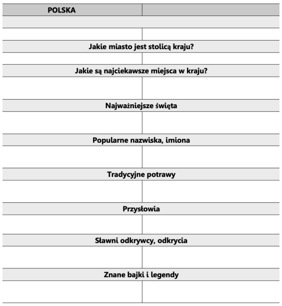 Nauczyciel łączy uczniów w grupy (4–5 osób). Każda grupa otrzymuje kartę z informacjami o Polsce i Chinach oraz segreguje informacje o tych krajach według pytań.