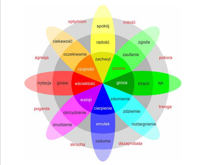 Konteksty pedagogiczne i artystyczne: Aby ułatwić uczestnikom wykonanie ćwiczeń, proponowanych w tym konspekcie, można udostępnić im listę emocji. Często bowiem nie do końca zdajemy sobie sprawę, czym są emocje i błędnie uznajemy za nie np. zmęczenie. Listę emocji można zaczerpnąć np. z przedstawionego poniżej koła emocji Roberta Plutchika. Koło emocji zostało opracowane w latach 1960–1980 i zakłada istnienie ośmiu podstawowych emocji (znajdujących się w środku koła) oraz emocji pochodnych, będących kombinacją pierwotnych. Emocje, które na diagramie ukazano jako sąsiadujące, mogą być odczuwane jednocześnie i łączyć się w nowe, zwane diadami. Emocje przeciwstawne natomiast nie mogą być ze sobą łączone, gdyż między nimi istnieje konflikt.