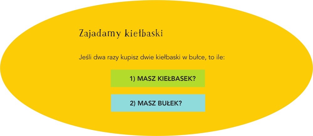 Rozwiązanie „Zajadamy kiełbaski”: Jeśli „dwie kiełbaski w bułce” oznacza to samo, co u Bystrzaka, to chodzi o dwie kiełbaski w tej samej bułce. Zatem jeśli kupisz „dwie kiełbaski w bułce” dwa razy, masz razem cztery kiełbaski i dwie bułki. O ile już ich nie zjadłeś.