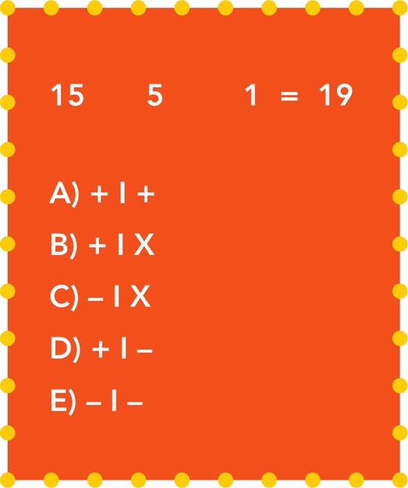 Rozwiązanie „Znajdź znaki”: D. 15 + 5 – 1 = 19.
