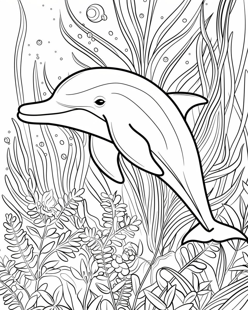 Delfiny mają smukłe, opływowe ciała, które ułatwiają im szybkie pływanie. Ich skóra jest gładka i często szara z białymi plamami i białym brzuchem. Delfiny oddychają powietrzem atmosferycznym, wynurzając się co pewien czas, aby nabrać powietrza przez otwór nosowy umieszczony na czubku głowy. Na obrazku delfin jest szary wśród zielonych roślin i błękitnej wody wypełniającej tło.