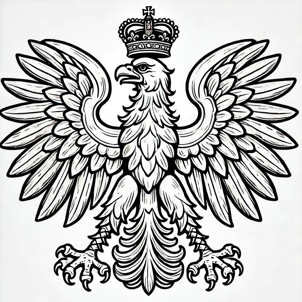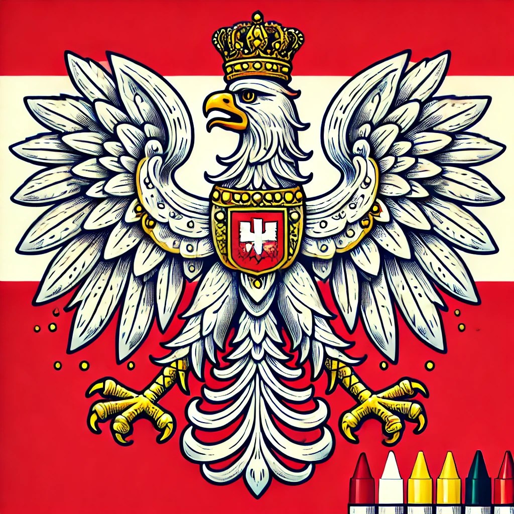 - Godło Polski – biały orzeł z koroną na czerwonym tle, który jest symbolem siły, odwagi i niepodległości.