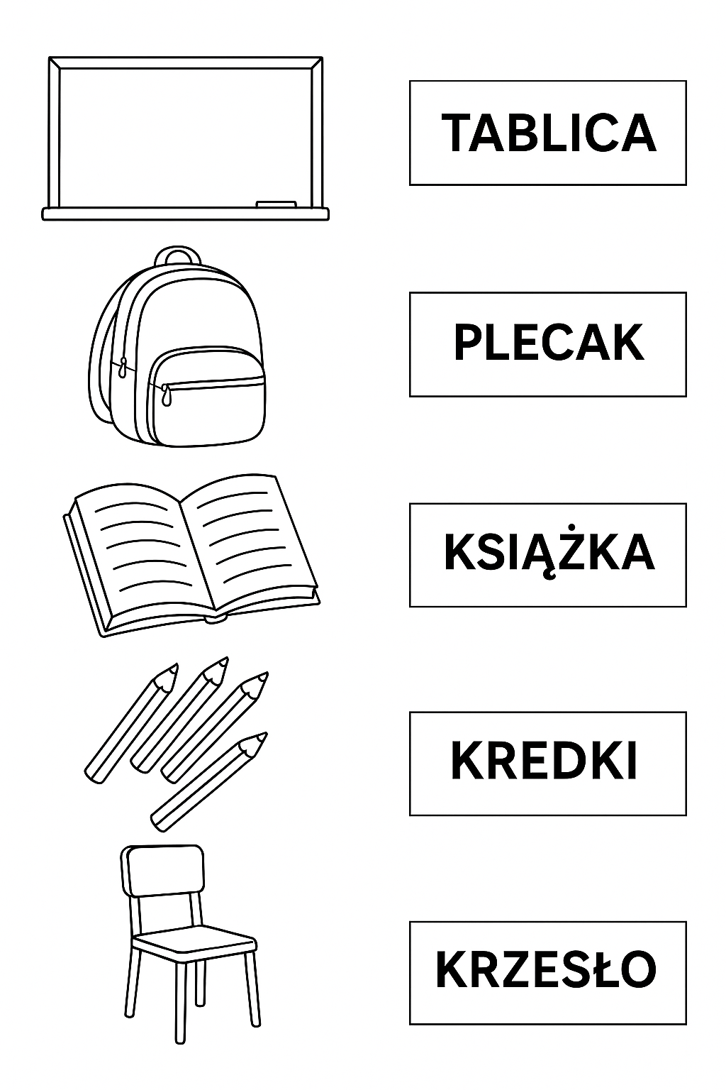 - Nauka słownictwa związanego z klasą i szkołą (tablica, ławka, książka, plecak).