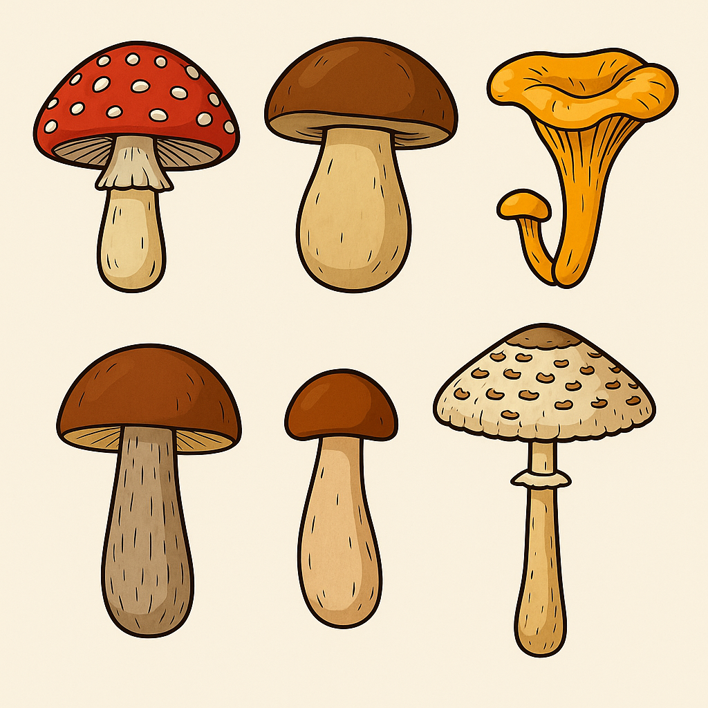 - Grzyby jadalne – bezpieczne i smaczne, które można jeść (np. borowik, kurka, koźlarz, kania).