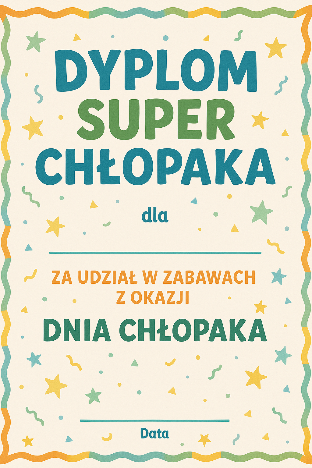 🎨 Do scenariusza możesz wykorzystać trzy przygotowane wcześniej wersje dyplomów „Super Chłopaka” – kolorową, ozdobną oraz czarno-białą do kolorowania.