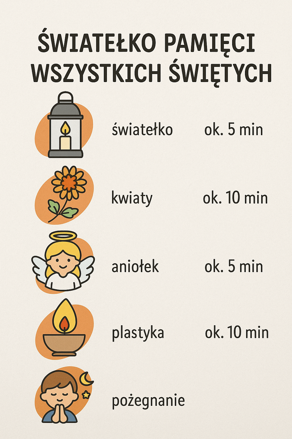 👩🏫 „Dzień dobry, kochani! Dzisiaj porozmawiamy o bardzo wyjątkowym dniu – o Wszystkich Świętych. To taki dzień, kiedy ludzie idą na cmentarz i zapalają światełka – takie małe lampki, które świecą bardzo ciepło. To światełka pamięci. Dzięki nim przypominamy sobie tych, których już z nami nie ma – babcię, dziadka, ciocię albo nawet ukochanego pieska. To znak, że o nich pamiętamy i że ich bardzo kochamy.”